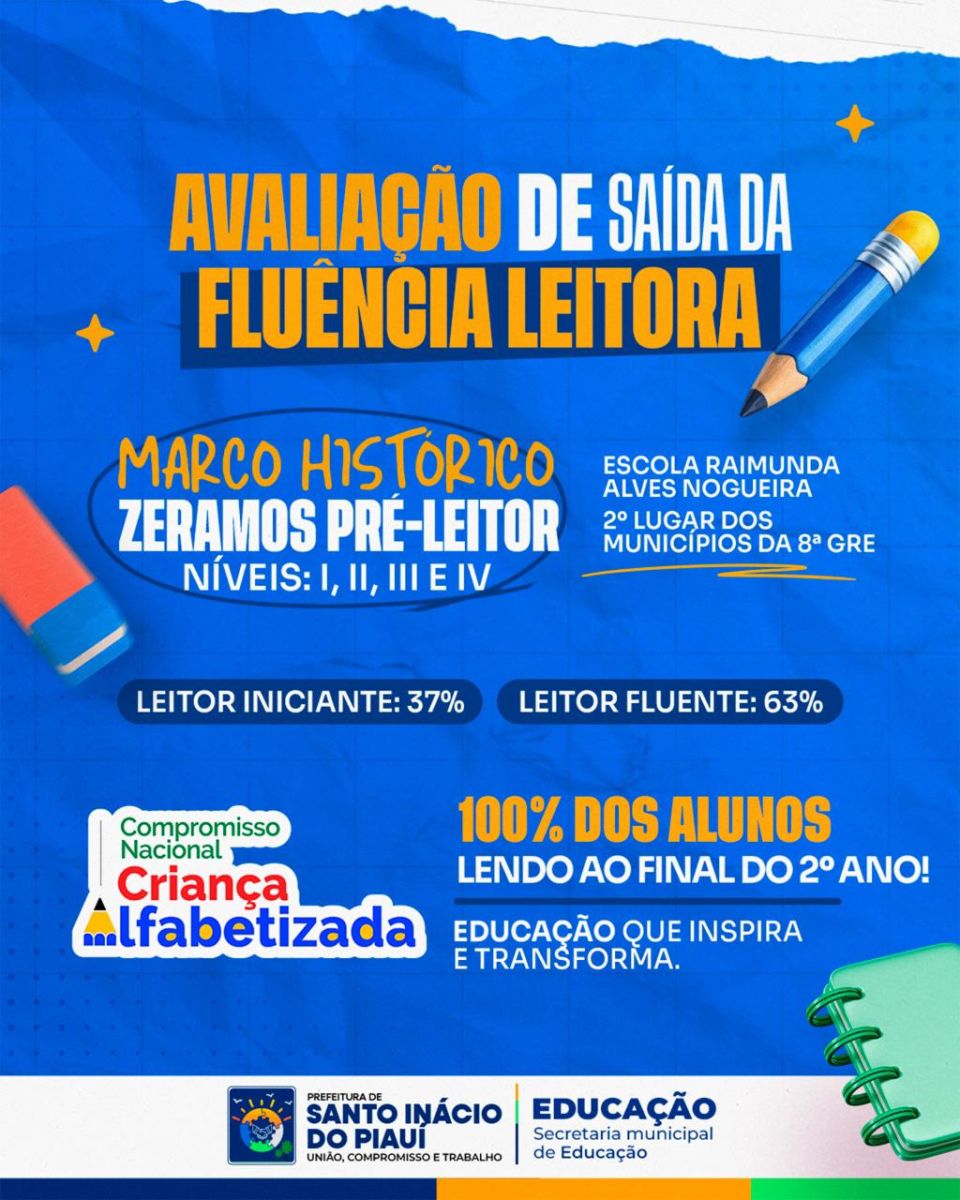A Prefeitura de Santo Inácio do Piauí, por meio da Secretaria de Educação, celebra o resultado da avaliação de saída da fluência leitora: o índice de pré-leitor foi zerado, um marco histórico na educação do município.