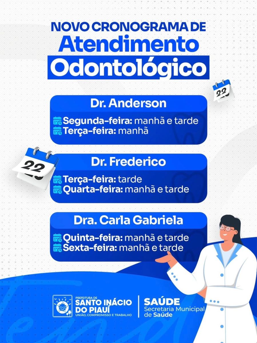 Neste dia 01 de março, a Prefeitura de Santo Inácio do Piauí, por meio da Secretaria Municipal de Saúde, divulgou o novo cronograma de atendimento odontológico no município. A iniciativa tem como objetivo organizar os serviços, ampliar o acesso da população e garantir maior eficiência nos atendimentos realizados nas unidades de saúde.